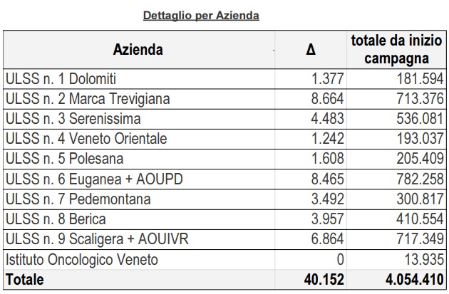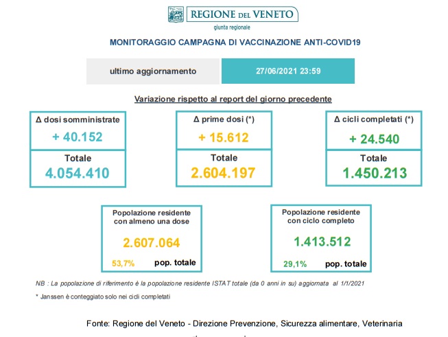 Più di 40 mila persone sono state vaccinate in Veneto ieri. Superata quota 4 milioni di somministrazioni. Il 53,7% della popolazione ha ricevuto almeno una dose mentre il 29,1% della popolazione è stato completamente vaccinato