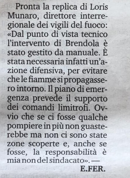 Nel merito dell’intervento di Brendola, non si può affermare che è stato svolto da “manuale”, ma, grazie allo spirito di abnegazione dei vigili del fuoco si è riusciti a domare l’incendio con mezzi e attrezzature arrivati da alti comandi. “Il manuale” prevede l’invio immediato di mezzi e attrezzature di supporto indispensabili ma non c’era il personale e quindi si è provveduto a chiederlo ad altri comandi. Il Direttore dovrebbe informarsi se la centrale di Vicenza ha una seconda autobotte, ad esempio, oppure verificare quanto tempo sono state “scoperte” vaste zone di territorio della regione, se sono stati garantiti i cambi al personale. Il sindacato ha il compito di denunciare questo e fare in modo che tutto vada per bene, ma probabilmente si tende sempre più ad insabbiare per motivi di carriera piuttosto che reclamare, come facciamo noi, un potenziamento del dispositivo di soccorso. D’altronde chi glielo fa fare visto il lauto stipendio e la posizione di dirigente generale, in vetrina negli eventi e che ignora la situazione del soccorso ? L’ affermazione del direttore alla stampa è presuntuosa e denota arroganza oltre ad essere palesemente fuori strada perché si deve concorrere verso un miglioramento del servizio di soccorso di cui, i sindacati, sono indubbiamente attori importanti”.
