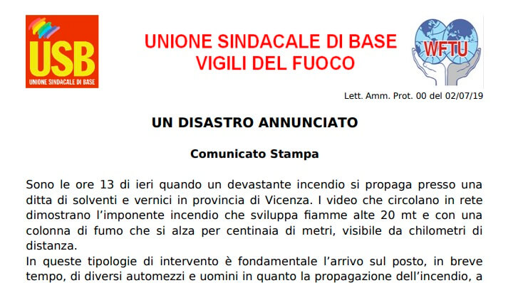 L’Unione Sindacale di Base di Vigili del Fuoco ha diramato poco fa un durissimo comunicato stampa nel quale denuncia la pesante carenza di mezzi mobilitati per far fronte al devastante incendio alla Isello Vernici. “Sono le ore 13 di ieri -scrivono- quando un devastante incendio si propaga presso una ditta di solventi e vernici in provincia di Vicenza. I video che circolano in rete dimostrano l’imponente incendio che sviluppa fiamme alte 20 mt e con una colonna di fumo che si alza per centinaia di metri, visibile da chilometri di distanza. In queste tipologie di intervento è fondamentale l’arrivo sul posto, in breve tempo, di diversi automezzi e uomini in quanto la propagazione dell’incendio, a causa delle alte temperature, potrebbe essere tanto veloce da non riuscire a controllarla. Il presente comunicato stampa è per denunciare ancora una volta l’inadeguata risposta all’urgente richiesta di intervento che ha comportato la necessità di inviare rinforzi da altri comandi della regione per sopperire alla mancanza di personale e automezzi. Sono stati smobilitati ben 5 comandi provinciali, lasciando sguarniti interi territori della regione. Non solo Vicenza è in queste condizioni ma tutti i comandi provinciali. Parimenti automezzi e attrezzature, insufficienti all’evento, sono stati richiesti da altri comandi VF della regione, con un logico aumento dei tempi di intervento. Un conto è che giunga sul posto un supporto in tempi congrui, un altro che sia costretto a partire da quasi 100 km di distanza. Inoltre ci si affida sempre al senso di responsabilità del personale che, contattato telefonicamente, è rientrato in servizio pur non essendo prevista una vera e propria reperibilità, abusando quindi del senso del dovere dei vigili del fuoco. Vastissime le zone della regione che, a seguito dell’evento, sono state sguarnite della presenza di vigili del fuoco. Il tutto sotto i limiti standard di sicurezza per gli operatori e per la buona riuscita dell’intervento. Per fortuna che nel frattempo non è pervenuta un’ulteriore richiesta di soccorso, ma cosa sarebbe successo se fosse scoppiato un altro incendio, anche meno rilevante o un soccorso in acqua o un incidente stradale ? Per questi motivi USB Vigili del Fuoco del Veneto ha dichiarato lo stato di agitazione del personale VF e porterà al Prefetto di Vicenza un’analisi dettagliata delle criticità”.