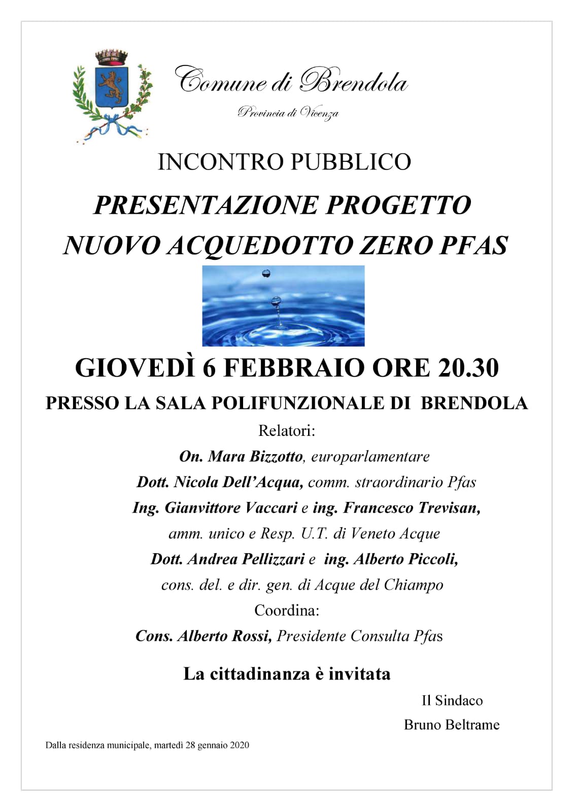 Giovedì 6 febbraio alle ore 20.30 presso la Sala Polifunzionale di Brendola, in Piazzetta del Donatore, si terrà l’incontro pubblico di presentazione del progetto del nuovo acquedotto “Zero Pfas”, una condotta per garantire acqua potabile e libera da Pfas.