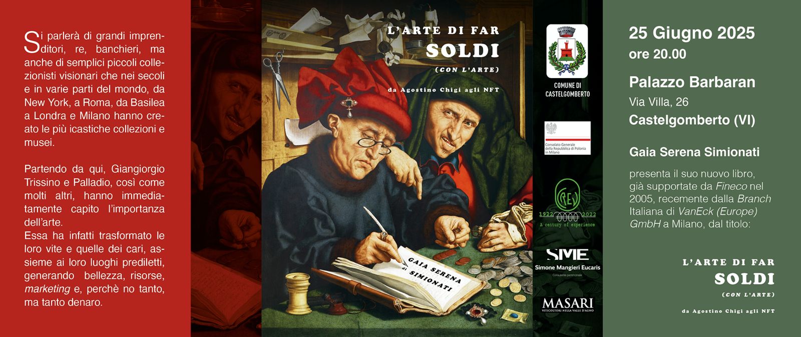 Castelgomberto (VI) – Un evento dedicato all’arte, alla bellezza e alla visione di chi, nei secoli, ha saputo trasformare l’intuito culturale in valore economico. Mercoledì 25 giugno 2025, alle ore 20.00, nella prestigiosa cornice di Palazzo Barbaran (via Villa 26), si terrà la presentazione del libro “L’Arte di Far Soldi (con l’Arte). Da Agostino Chigi agli NFT”, a cura di Gaia Serena Simionati, critica d’arte e cinema, curatrice indipendente e firma di lunga data nel panorama culturale italiano.