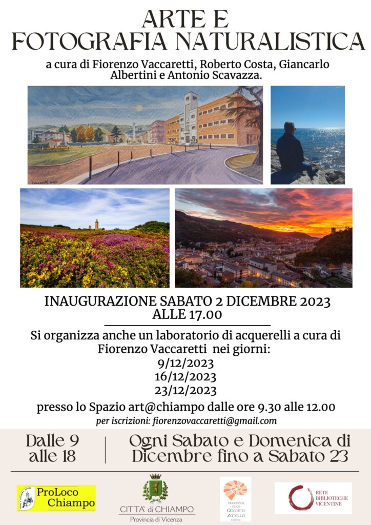 Aspettando il Natale a Chiampo verrà inaugurata sabato 2 dicembre alle ore 17.00 la mostra “Arte e fotografia naturalistica” a cura di Fiorenzo Vaccaretti, Roberto Costa, Giancarlo Albertini e Antonio Scavazza. La mostra, all’ultimo piano della biblioteca civica Zanella, resterà aperta ogni sabato e domenica dalle 9 alle 18 fino al 23 dicembre.