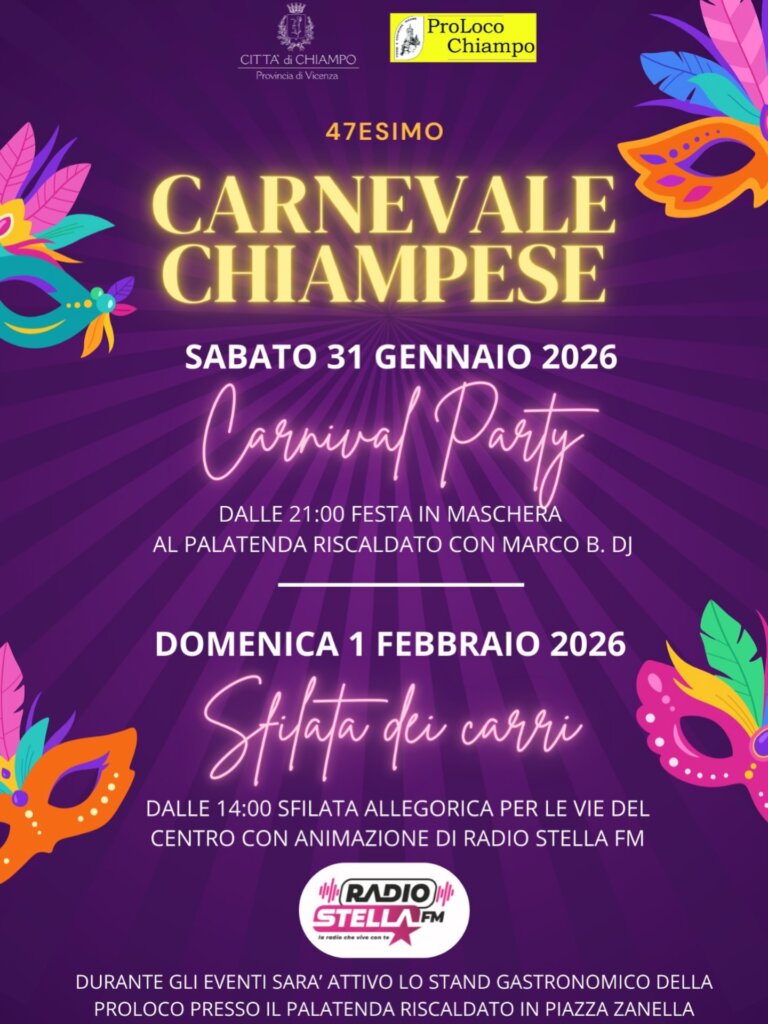 Chiampo si prepara a festeggiare il 47esimo Carnevale Chiampese con un fine settimana di eventi tra musica, maschere e tradizione. Il programma si apre sabato 31 gennaio con il Carnival Party: dalle 21.00 il Palatenda riscaldato ospiterà una festa in maschera animata da Marco B. Dj.