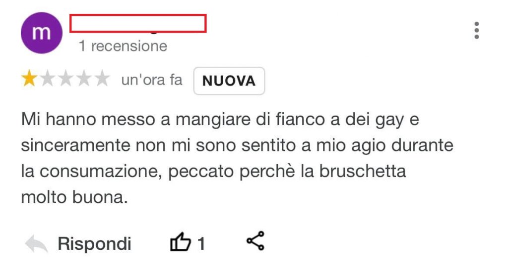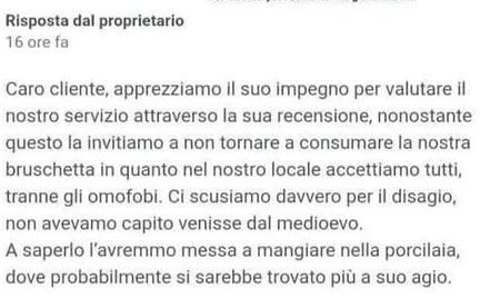 La Bruschetteria Faedo prende una netta posizione dopo che un utente, con un nome di fantasia, ha lasciato una discutibile recensione al locale perché si è trovato seduto vicino ad alcuni gay. Decide di pubblicare la recensione.