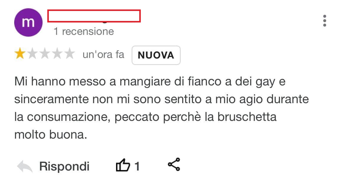 “Ci vediamo costretti e allo stesso tempo veramente dispiaciuti a dover condividere una recensione come questa. Invitiamo questa persona a non presentarsi più nel nostro locale e con questo post vogliamo prendere una posizione ben definita contro coloro che la pensano allo stesso modo. Ci sarebbe piaciuto dire direttamente queste cose a tale signore se solo ne conoscessimo il vero nome e cognome”.
