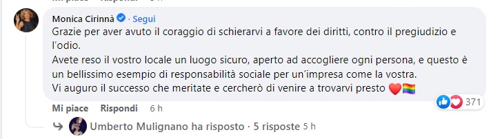 Una pubblicazione diventata subito virale con migliaia di ‘mi piace’ e centinaia di condivisioni e commenti. Tutti di solidarietà e riprovazione per quanto scritto dall’utente. Fra questi anche quello di Monica Cirinnà, la senatrice nota per la lotta per l’approvazione della legge 76/2016, appunto nota come “legge Cirinnà”, che ha istituito le Unioni civili in Italia sia per le coppie omosessuali sia per quelle eterosessuali. Cirinnà scrive: ” Grazie per aver avuto il coraggio di schierarvi a favore dei diritti, contro il pregiudizio e l’odio. Avete reso il vostro locale un luogo sicuro, aperto ad accogliere ogni persona, e questo è un bellissimo esempio di responsabilità sociale per un’impresa come la vostra. Vi auguro il successo che meritate e cercherò di venire a trovarvi presto”