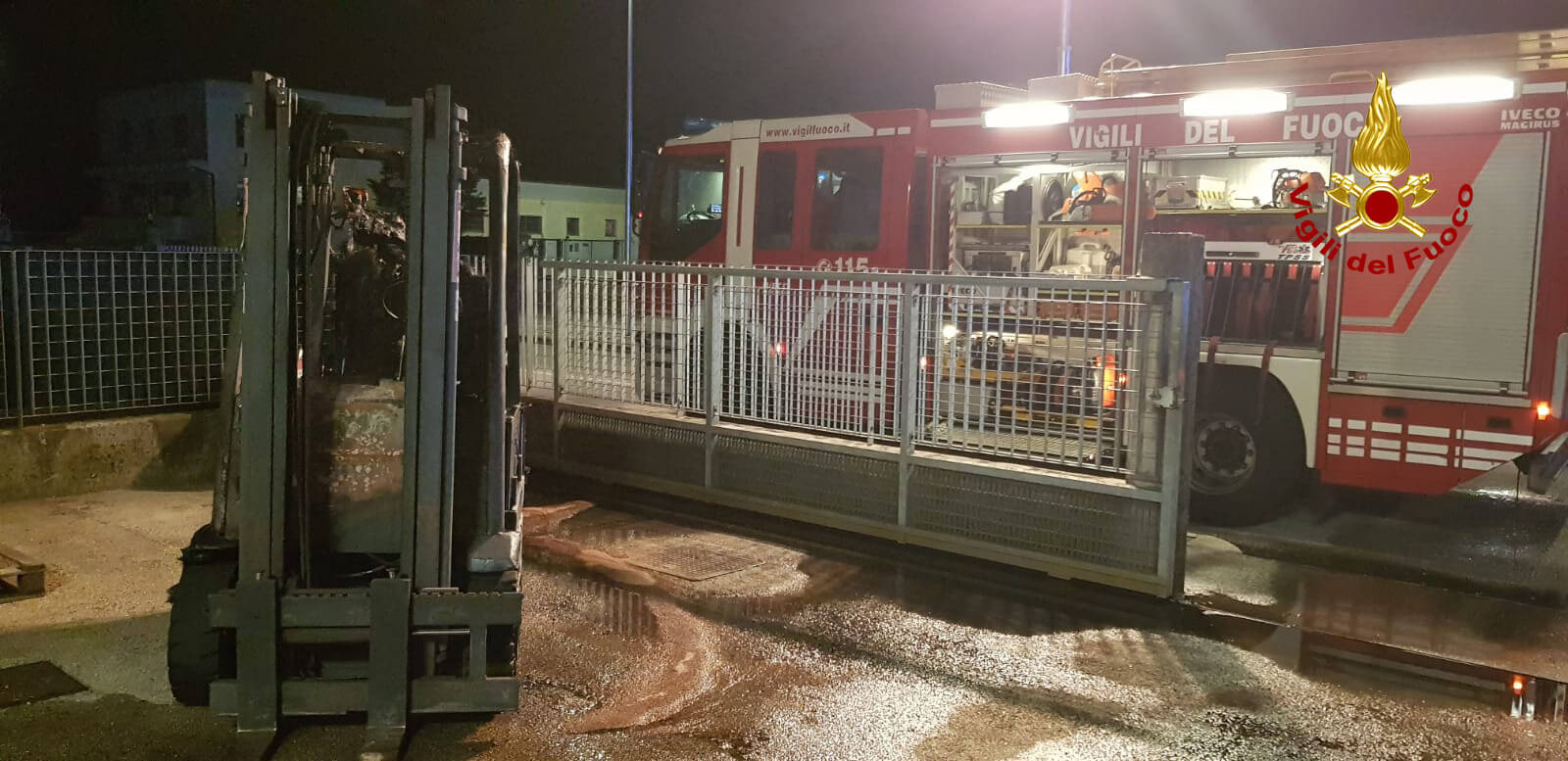 A fuoco muletto nella notte: vigili del fuoco intervengono in carpenteria
