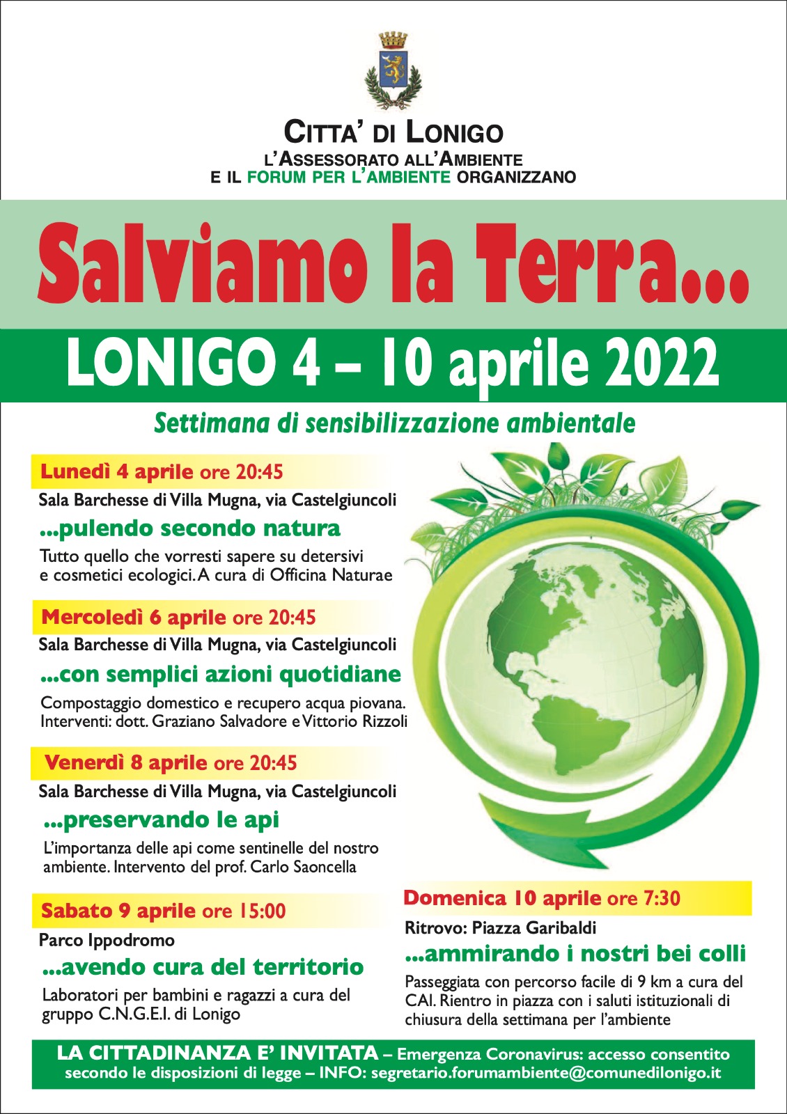 Il Forum per l’Ambiente col supporto dell’Assessorato all’Ambiente del Comune di Lonigo propone dal 4 al 10 aprile “Salviamo la terra…”: un’intera settimana di sensibilizzazione ambientale attraverso incontri e iniziative atte a portare la popolazione alla scoperta del mondo dell’ecologia e della salvaguardia del territorio. “Una proposta di eventi a tema che proponiamo alla comunità: attraverso semplici azioni, ma cariche di consapevolezza e senso di responsabilità, vogliamo ribadire l’importanza della Terra e della sua salvaguardia” – commenta la presidente del Forum Emanuela Foletto. Si apre lunedì 4 aprile alle 20.45 presso la Sala Barchesse di Villa Mugna in via Castelgiuncoli con “…pulendo secondo natura”, un incontro per conoscere i detersivi e cosmetici ecologici a cura di Officina Naturae. Mercoledì 6 aprile alle 20.45 presso la Sala Barchesse, invece, si parlerà di compostaggio domestico e recupero dell’acqua piovana “…con semplici azioni quotidiane” a cura dei dott. Graziano Salvadore e Vittorio Rizzoli. Venerdì 8 sempre alle 20.45 presso la Sala Barchesse sarà la volta di un viaggio nel mondo delle sentinelle del nostro ambiente con “…preservando le api” a cura del prof. Carlo Saoncella. Sabato 9 aprile a partire dalle 15 presso il Parco Ippodromo “..avendo cura del territorio”, laboratori per bambini e ragazzi a cura del gruppo CNGEI di Lonigo. Si chiude domenica 10 aprile con un ritrovo in Piazza Garibaldi alle 7.30 e la passeggiata “…ammirando i nostri bei colli”: un percorso adatto a tutti di 9 km a cura dei Cai. Al rientro in piazza, i saluti finali.