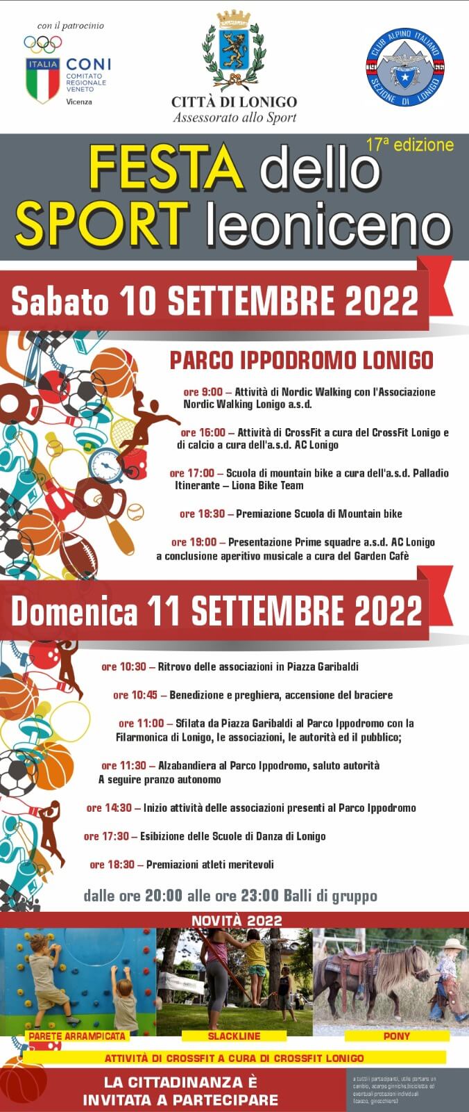 Si parte sabato mattina alle 9 con il nordic walking dell’associazione Nordic Walking Lonigo per poi passare a svariate attività pomeridiane: alle 16 il crossfit con il CrossiFit Lonigo, il calcio con l’asd AC Lonigo; alle 17 la scuola di mountain bike a cura dell’asd Palladio Itinerante – Liona Bike Team con la conseguente premiazione, alle 18.30, della scuola di mountain bike. Alle 19 la presentazione delle prime squadre dell’asd AC Lonigo e a conclusione un ottimo aperitivo musicale a cura del Garden Cafè. La novità 2022 riguarderà in particolare i bambini: durante tutto il weekend sportivo, infatti, ci sarà infatti la possibilità di provare una parte di arrampicata dedicata ai più piccoli, testare il proprio equilibrio sulla slackline e fare un giro con i pony. Domenica mattina alle 10.30 tutte le associazioni si ritroveranno in Piazza Garibaldi per la benedizione, la preghiera e l’accensione del braciere alle 10.45. Alle 11 partirà la sfilata di associazioni, sportivi, autorità e pubblico che da Piazza Garibaldi porterà tutti al Parco Ippodromo, accompagnati dalla Filarmonica di Lonigo: qui , alle 11.30, avverrà l’Alzabandiera e il saluto delle autorità. Nel pomeriggio, a partire dalle 14.30, inizieranno le attività di tutte le società sportive presenti al Parco Ippodromo. Alle 17.30 si esibiranno le scuole di danza cittadine e alle 18.30 una sentita cerimonia premierà gli atleti meritevoli. Infine, per terminare in allegria, balli di gruppo per tutti i presenti, dalle 20 alle 23.