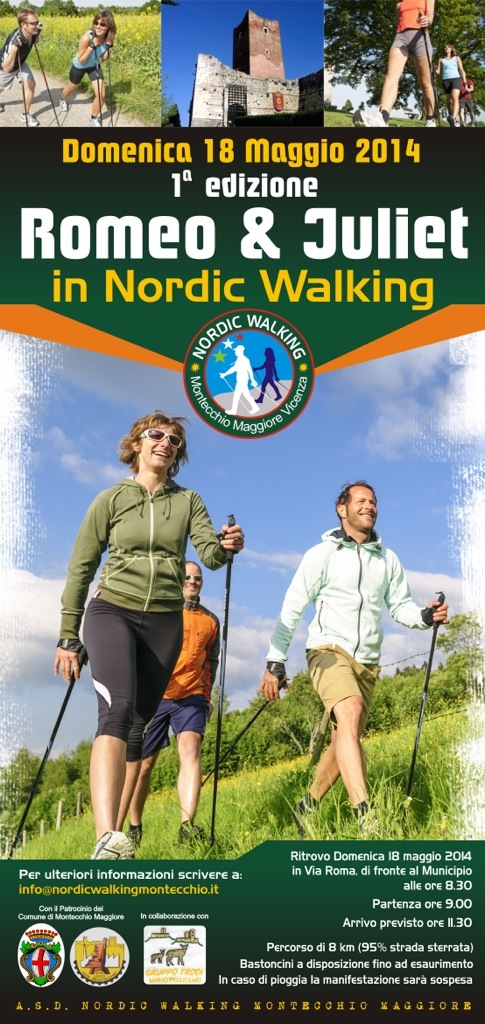 Si intitola “Romeo & Juliet in nordic walking” ed è la prima edizione di un evento che intende condurre tutti gli appassionati di nordic walking – una salutare tecnica di podismo con l’ausilio di bastoncini – lungo i percorsi più suggestivi di Montecchio Maggiore, sulle orme degli eterni innamorati Romeo e Giulietta.