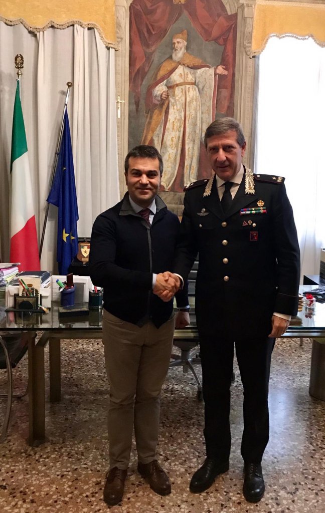 Questa mattina, mercoledì 27 novembre, il Comune di Noventa Vicentina ha avuto l’onore di ricevere la visita del Generale Fabrizio Parrulli, Comandante della Legione Carabinieri del Veneto. “Un momento particolarmente significativo per tutta la nostra comunità – ha commentato il Sindaco Mattia Veronese – un gesto di grande attenzione da parte del Comandante regionale dell’Arma da poco chiamato a ricoprire questo importante ruolo”. Il Generale Parrulli, accolto dal Sindaco Mattia Veronese e da alcuni componenti dell’Amministrazione comunale, era accompagnato dal Colonnello Nicola Bianchi Comandante Provinciale, dal Capitano Umberto Gallucci Comandante Compagnia Vicenza, dal Maresciallo Davide Agnello Comandante stazione di Noventa e dal cappellano militare don Corrado Tombolan. “Il nostro Comune, come tante Istituzioni locali, ha un rapporto diretto e costante con le Forze dell’ordine e questo è garanzia di attenzione, presenza, tutela della legalità e presenza dello Stato” – ha concluso Veronese.