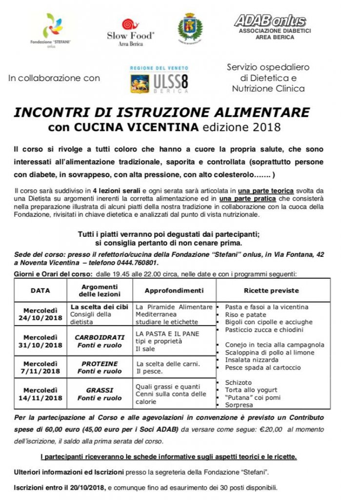 L’Associazione Diabetici Area Berica, la Condotta Slow Food e la Fondazione Stefani Onlus, organizzano quattro incontri di ”istruzione alimentare con cucina vicentina”. Questa iniziativa è patrocinata dall’Amministrazione Comunale.