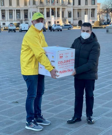 Da alcune settimane sono stati consegnati alcuni pacchi alimentari da parte di Coldiretti Vicenza ai Servizi sociali e associazioni caritatevoli per famiglie e persone in difficoltà. La consegna è avvenuta anche a Noventa Vicentina per il tramite degli Uffici comunali preposti. Tutti i prodotti consegnati sono alimenti di prima necessità, a lunga conservazione e provenienti dalle aziende agricole del territorio. “Ringraziamo la sezione Coldiretti locale – commenta il sindaco Mattia Veronese – per la solidarietà che sempre dimostra verso le fasce più deboli”. (Nella foto il momento di consegna con il delegato giovani Coldiretti Vicenza, Marco Buratti)