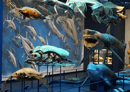 La collezione della ‘Natura e dell’Uomo” nasce dalla fusione delle straordinarie raccolte naturalistiche costruite per secoli da studiosi ed esploratori dell’Università di Padova, a fini di ricerca e didattica, integrate da alcuni pezzi importanti frutto di scambi con altri Musei internazionali. Come la ‘star’ del Museo, la Trige dai denti a sciabola dell’Era Glaciale – uno dei personaggi dell’omonimo film animato – Il grande felino – lo scheletro è presentato accanto alla riproduzione a grandezza naturale di quello che sarebbe stato l’animale in natura – è noto tra gli studiosi come Smilodon fatalis. E’ l’unico esemplare nel suo genere in Italia e fra i pochi presenti nei musei europei; un fossile che risale al Pleistocene Superiore e proviene dal sito di Rancho La Brea in California (Usa), uno tra i più importanti giacimenti fossiliferi al mondo. Di grande interesse sono le sale dedicate ai reperti trovati in uno dei più grandi siti fossili del Paese, Bolca (Verona): di grande effetto è quella che è stata denominata “la spiaggia delle Palme”, con decine di esemplari fossili provenienti dal sito veronese. Restando alla paleontologia, un altro gioiello della collezione è rappresentato da un rarissimo esemplare di Mesosauro, una lucertola progenitrice dei dinosauri, presentata nel museo padovano con uno scheletro fossile perfetto, frutto di una donazione privata.