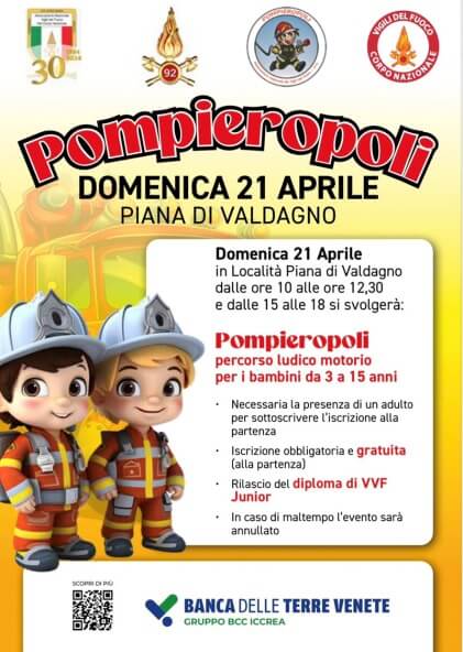 Nell’occasione del 4° campionato trail vigili del fuoco sempre in località Piana sarà allestito “Pompieropoli” a cura dell’associazione nazionale Vigili del fuoco. Un percorso ludico motorio per i bambini che si dovranno mettere alla prova per guadagnarsi il diploma di Pompiere Junior. Gli aspiranti vigili del fuoco in erba dovranno affrontare diverse prove: scendere dal palo, attraversare un tunnel, entrare in una casa piena di fumo, spegnere un incendio, salvare un gattino.
