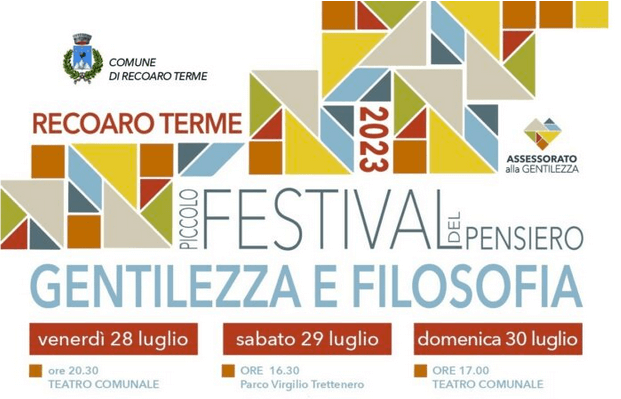 Il Comune di Recoaro Terme con l’Assessorato alla Gentilezza promuovono la prima edizione del Piccolo Festival del Pensiero: Gentilezza e Filosofia, che si terrà nella Conca di Smeraldo dal 28 al 30 luglio. La manifestazione è curata da Keren Ponzo.