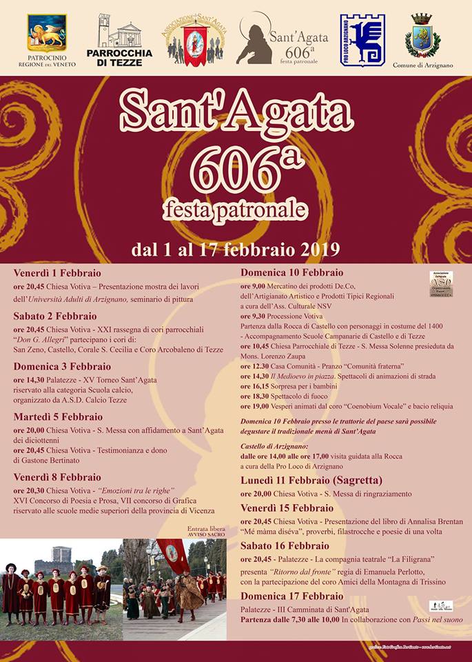 La Festa prevede però una lunga serie di appuntamenti che si snoderanno da venerdì 1 a domenica 17 febbraio, organizzati grazie al prezioso lavoro dell’Associazione Sant’Agata in collaborazione con l’Amministrazione Comunale, la Pro Loco di Arzignano, la Parrocchia di Tezze e la Pro Loco.
