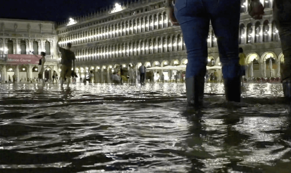 La città di Venezia è stata sorpresa dall’acqua alta, un evento molto raro ad agosto (il frame è ripreso da un video di Local Team)