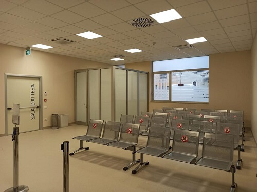 I nuovi ambienti sono stati dotati delle più avanzate tecnologie sia in termini di scelta dei materiali che impiantistiche, con una particolare attenzione all’igiene degli ambienti. Così, non solo i nuovi spazi sono molto più ampi rispetto al precedente Punto Prelievi, ma le sale di attesa sono dotate di sistema di ricircolo dell’aria, mentre gli ambulatori e i locali ad uso comune sfruttano un impianto di condizionamento con terminali dotati di filtro elettrostatico per la depurazione dell’aria, in grado di eliminare quindi gli inquinanti quali polvere e fibre ma anche sostanze microbiologiche come batteri, funghi etc.