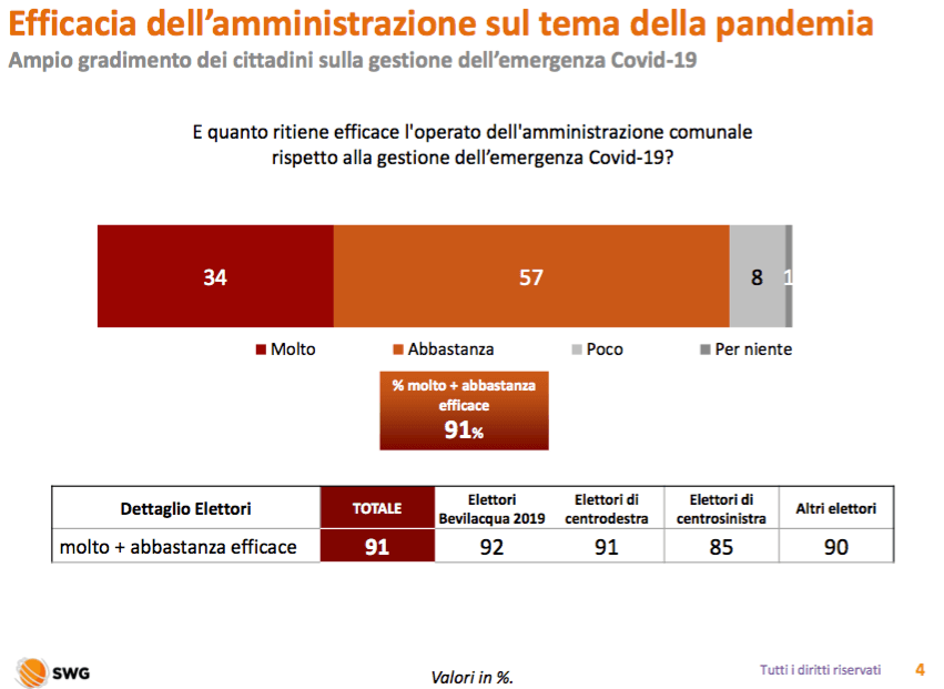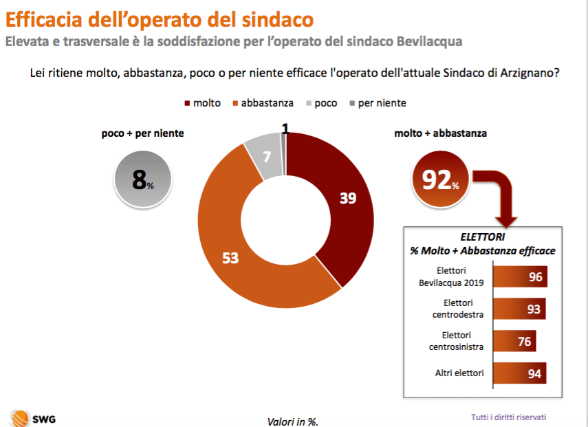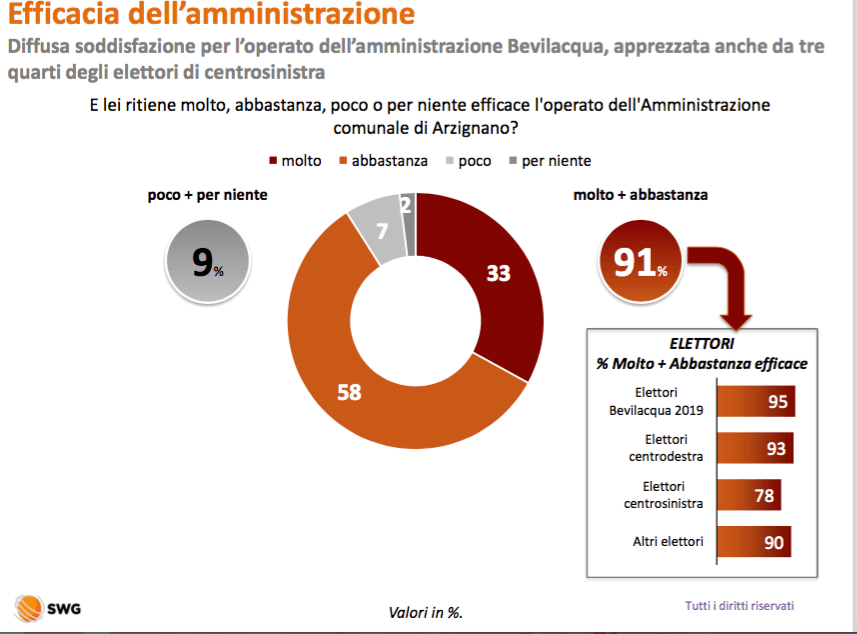 L’efficacia dell’operato di Alessia Bevilacqua, Sindaco di Arzignano, è molto buona per il 92% dei cittadini: questo il risultato più evidente di un un’indagine quantitativa condotta con rilevazioni telefoniche, all’interno di un campione di 400 arzignanesi. Le interviste sono state somministrate nel periodo che va dal 1 al 9 dicembre 2020 e gli altri risultati sono riassunti nelle tabelle sottostanti: non solo il Sindaco gode di ottima considerazione, ma anche l’amministrazione comunale stessa è ritenuta soddisfacente dal 91% degli intervistati, apprezzata anche da una buona fetta degli elettori di centrosinistra. Al 91% anche la fiducia/notorietà del primo cittadino arzignanese. Anche la recente emergenza Covid19 è stata gestita adeguatamente secondo i residenti della città del Grifo.