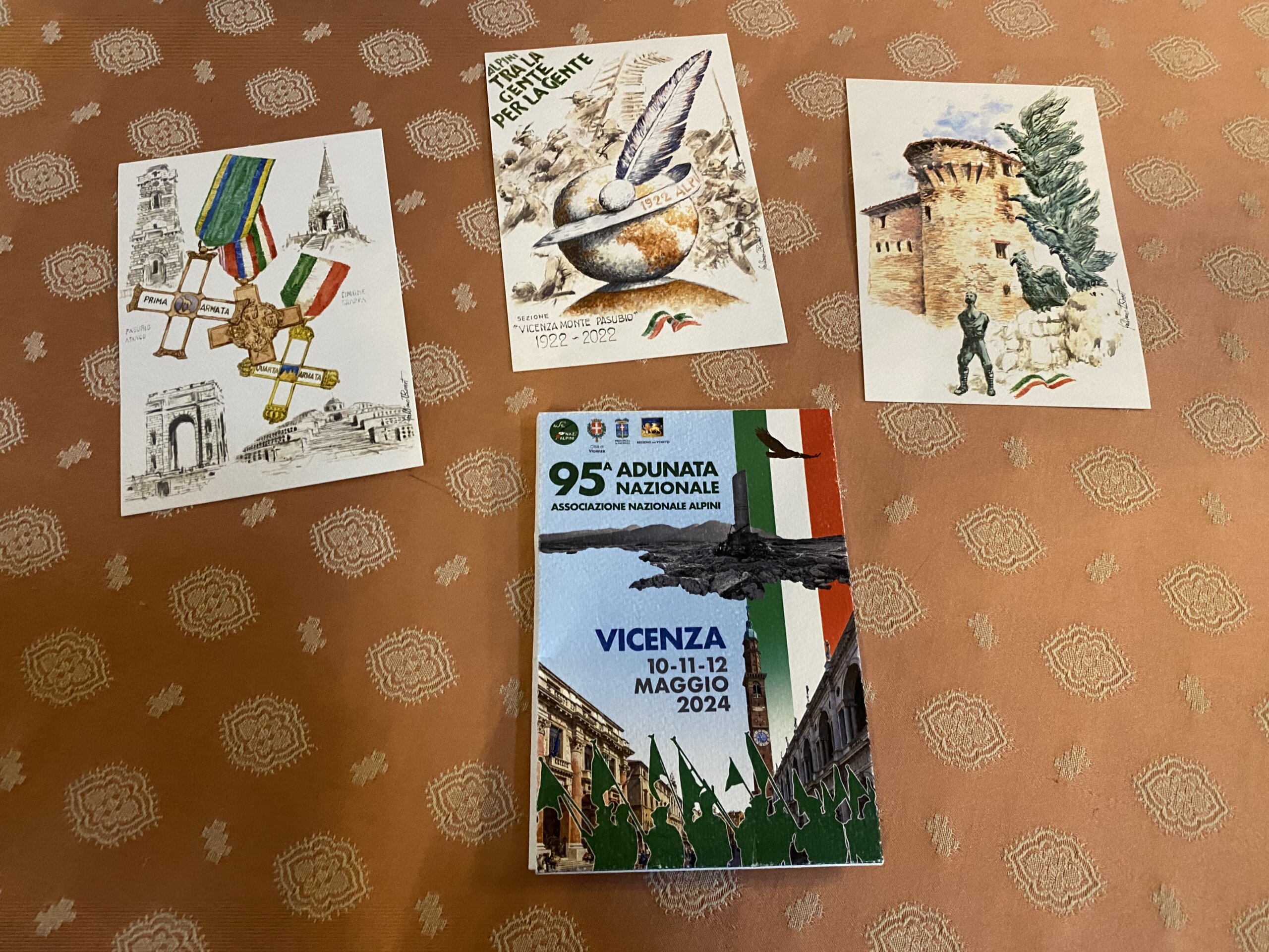 Dal 10 al 12 maggio ai punti vendita in Contra’ Garibaldi e in viale Roma sarà possibile acquistare, al prezzo di 10 euro, il cofanetto con le cartoline ufficiali della 95ª Adunata. La custodia, sulla quale è raffigurato il manifesto dell’Adunata, contiene 3 cartoline d’autore, realizzate dall’artista vicentino Galliano Rosset, rappresentative della città e del territorio in connessione con il mondo degli Alpini. Sulla prima cartolina sono raffigurati il Torrione, sede della Sezione Vicenza “Monte Pasubio” e il monumento alle sette aquile di Monte Berico; in primo piano il patriota Cesare Battisti, irredentista e ufficiale degli Alpini nel battaglione Vicenza. La seconda cartolina è dedicata al Monumento degli Alpini che si trova davanti alla stazione di Vicenza, inaugurato nel 2022, in occasione del centenario della Sezione. L’ultima cartolina riporta ai luoghi della memoria con l’immagine dei sacrari dei Monti Pasubio e Cimone, di Asiago e del Monte Grappa, affiancati alle Croci commemorative della Prima Armata, dell’Armata degli Altipiani e della Quarta Armata. Tre sono anche i francobolli speciali, dedicati ai cento anni dell’Associazione Nazionale Alpini, allo scrittore Mario Rigoni Stern e al beato Teresio Olivelli, mentre gli annulli filatelici pensati in accordo con Poste Italiane, differenti per ogni giorno di manifestazione, raffigurano il logo dell’Adunata. Il costo della cartolina singola senza annullo è di 1 euro.