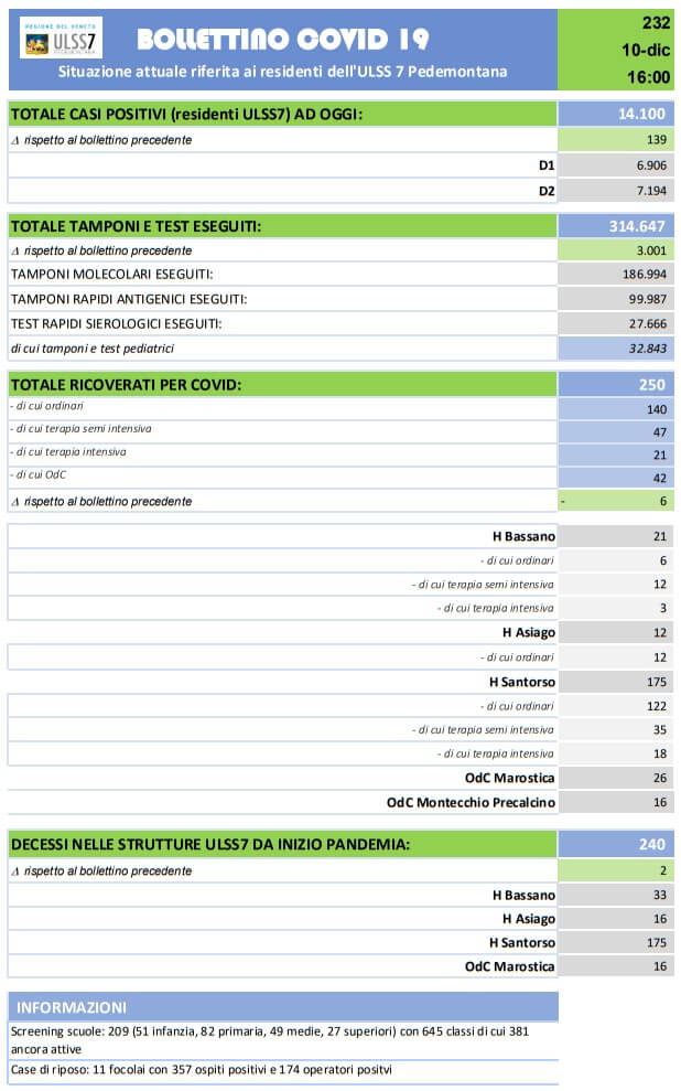 I due bollettini quotidiani delle Ulss 8 Berica e 7 Pedemontana fotografano una situazione che permane di sofferenza per il sistema ospedaliero provinciale. Aumentano ancora, infatti, i ricoveri nel Vicentino. Le persone in ospedale per covid sono in totale 569.