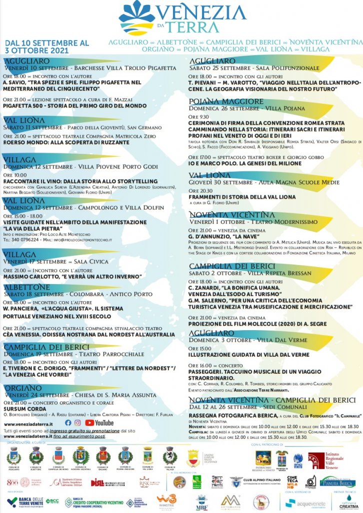 con il Patrocinio della Regione del Veneto, Provincia di Vicenza e Istituto Ville Venete, presentano un ricco programma di eventi culturali per l’edizione 2021 di Venezia da Terra – Festival della storia.
