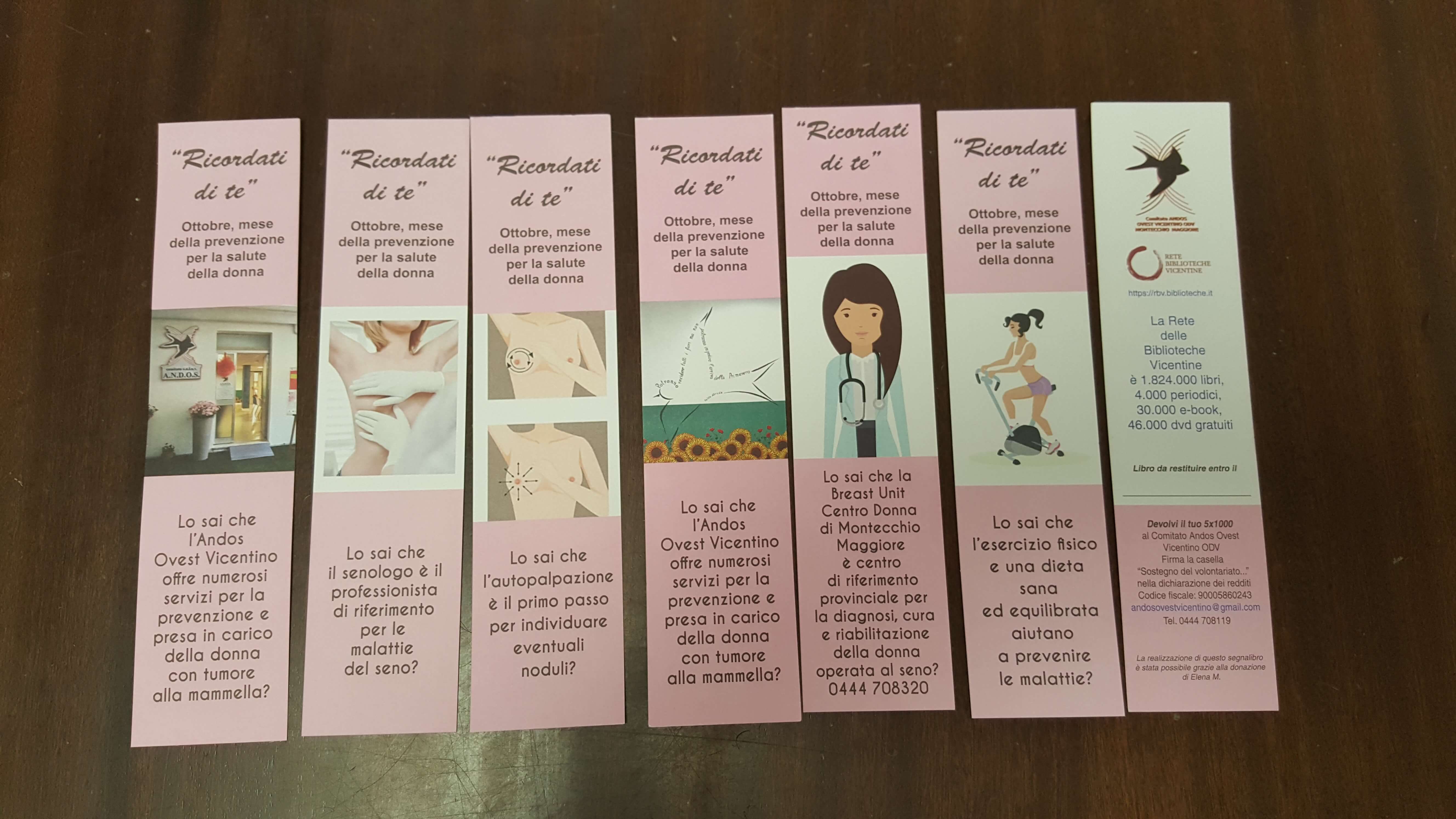 La prevenzione passa anche per i segnalibri. Dall’inizio di ottobre, infatti, in tutte le biblioteche della provincia di Vicenza ne sono in distribuzione sessantamila, grazie alla donazione di una volontaria dell’Andos, che invitano gli utenti a “ricordarsi di sé” fornendo consigli e curiosità.