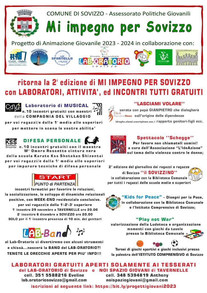 Con il supporto dell’Associazione Ceis Onlus di Vicenza sono state raccolte dalle Associazioni aderenti al Progetto una serie di proposte che verranno gratuitamente offerte, nei prossimi mesi, ai giovani iscritti alle Associazioni Giovanili Lab-Oratorio di Sovizzo e Noi Spazio Giovani di Tavernelle.