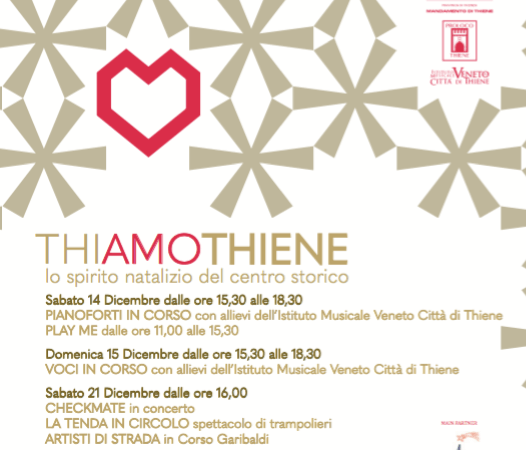 L’Istituto Musicale Veneto “Città di Thiene” con il collaudato format “Pianoforti e voci in corso” ripropone la bella iniziativa nel weekend del 14 e 15 dicembre in diversi luoghi del centro storico thienese. Un modo diverso di vivere il centro e di stare insieme, che unisce il passeggio fra le botteghe, negozi e locali con la condivisione della musica, suonata e cantata, sia dagli allievi dell’Istituto Musicale cittadino che di chiunque abbia il piacere di partecipare, mettendosi in gioco, dando così vita ad un gioioso scambio di saluti e melodiche conversazioni augurali. I negozianti saranno invitati a utilizzare le nuove vetrofanie e a puntare sul colore rosso per dare continuità al tema del Cuore, in modo che ne possa risultare un’immagine collettiva di unità sostanziale attorno al sentimento per la propria città.