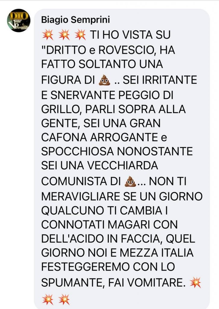 “Non ti meravigliare se un giorno qualcuno ti cambia i connotati magari con dell’acido in faccia, quel giorno io e mezza Italia festeggeremo con lo spumante“. Questo è ciò che un hater ha postato su Facebook dopo che ieri sera sono stata ospite di Paolo del Debbio a “Dritto e Rovescio”. A me i leoni da tastiera, che poi sono conigli nella vita vera, non hanno mai spaventato; mi preoccupa invece, e molto, l’odio contro donne ed in particolare contro quelle che si espongono di più. Mi preoccupa il fatto che molte ragazze non abbiano i mezzi per difendersi da queste minacce gravi ed infami e che possano essere indotte a fare passi indietro rispetto alle loro idee, ai percorsi di vita e professionali, spesso portati avanti con grandi sacrifici personali. Per questo invito ancora una volta tutte a denunciare sempre, così come ho fatto io oggi per individuare il mio hater: credo che anche le multinazionali dei social e del web dovrebbero fare di più per rendere la rete un terreno di libertà per tutte e tutti. Altrimenti così è solo un recinto per bestie feroci. Scriverò alla Commissaria Europea competente affinché si acceleri al fine di tutelare la dignità delle persone sui social contro ogni forma di violenza, compreso l’Hate Speech.