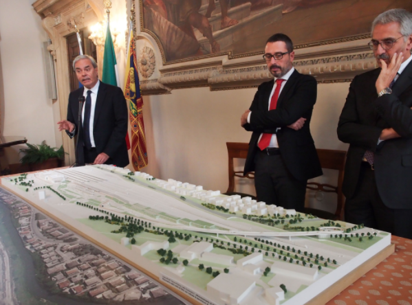 “Questo progetto aumenterà la qualità della vita della città. Questo progetto farà bene a Vicenza”. Con a fianco l’amministratore delegato e direttore generale di Rete Ferroviaria Italiana Maurizio Gentile e davanti agli occhi il grande plastico realizzato da RFI per rendere ancora più comprensibile la portata della trasformazione dell’area della stazione di viale Roma, il sindaco Achille Variati ha sottolineato oggi con queste parole la portata storica dell’arrivo a Vicenza dell’alta velocità. “Accanto al pur importante risultato di far passare i treni veloci per un capoluogo come Vicenza – ha detto il sindaco in occasione della prestigiosa visita del numero uno di RFI, chiamando al suo fianco anche l’assessore alla progettazione e sostenibilità urbana Antonio Dalla Pozza – questo progetto centra infatti una serie di altri obiettivi fondamentali per Vicenza e il suo territorio, dal recupero di suolo per la collettività alla promozione della mobilità pedonale e ciclabile, dalla valorizzazione della linea ferroviaria metropolitana all’opportunità di trasformare l’intero sistema del trasporto pubblico locale partendo dalla realizzazione del filobus elettrico. La nostra è una città storica delicata. L’ho detto da subito al gruppo di lavoro di RFI e Italferr che ringrazio per la grande sensibilità e attenzione con cui sta dimostrando di procedere. Ma è anche una città moderna che deve fare i conti con la grave problematica dell’inquinamento atmosferico. Questo progetto innovativo, che fa dell’intermodalità il suo punto di forza, contribuirà a combattere le polveri sottili in modo decisivo. Mai l’amministrazione comunale avrebbe potuto aspirare alle necessarie infrastrutture che arriveranno insieme ai treni veloci. Questa è un’opportunità storica per la nostra città. Spero che il mio successore raccolga il testimone del processo virtuoso che abbiamo avviato”. “Il progetto di attraversamento di Vicenza – ha dichiarato Maurizio Gentile, amministratore delegato e direttore generale di Rete Ferroviaria Italiana – è la dimostrazione che la collaborazione con il territorio e gli enti locali può portare a esperienze fortemente positive. L’intervento presentato oggi renderà la stazione di Vicenza un vero e proprio hub intermodale, punto di scambio tra le diverse modalità, al servizio dei viaggiatori e dei cittadini. Il progetto recupera inoltre spazi e luoghi da restituire alla città, connessi tra loro da nuovi percorsi ciclopedonali e viari. Il tutto in piena sintonia con il piano industriale del Gruppo FS Italiane 2017-2026, che mette le stazioni al centro dell’esperienza di mobilità, recuperandole e assegnando loro un nuovo ruolo”. L’intervento dell’ingegner Gentile è stato preceduto dalla presentazione delle linee generali del progetto preliminare relativo al tratto dal bivio Vicenza fino alla stazione di viale Roma, a cura di Daniela Lezzi, direttore Investimenti Progetti AV di Rete Ferroviaria Italiana. L’architetto Elio Marino, responsabile Architettura, Stazioni e Territorio di Italferr, ha quindi illustrato nel dettaglio le trasformazioni previste nel tratto tra il quartiere dei Ferrovieri e la stazione di viale Roma, rappresentate nel grande plastico che resterà esposto al Forum Center di piazza dei Signori. L’architetto, sottolineando come il progetto coniughi la visione trasportistica con quelle urbanistica e paesaggistica, ha evidenziato tra l’altro la realizzazione di un ininterrotto percorso ciclopedonale che si snoda attraverso un nuovo parco urbano ricavato su aree ferroviarie dismesse, la realizzazione di parcheggi esclusivamente sotterranei per le auto private che arrivano in stazione, il terminal e i servizi del trasporto pubblico locale integrati nel nuovo hub, la nuova piazza che si apre in superficie per viaggiatori e cittadini, diventando nuova porta della città.
