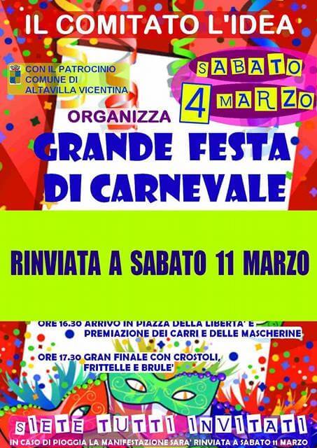Il comitato L’Idea di Altavilla Vicentina ha deciso di rinviare la sfilata di Carnevale di Altavilla Vicentina al giorno sabato 11 marzo, in quanto domani (4 marzo) le previsioni meteo non saranno favorevoli.