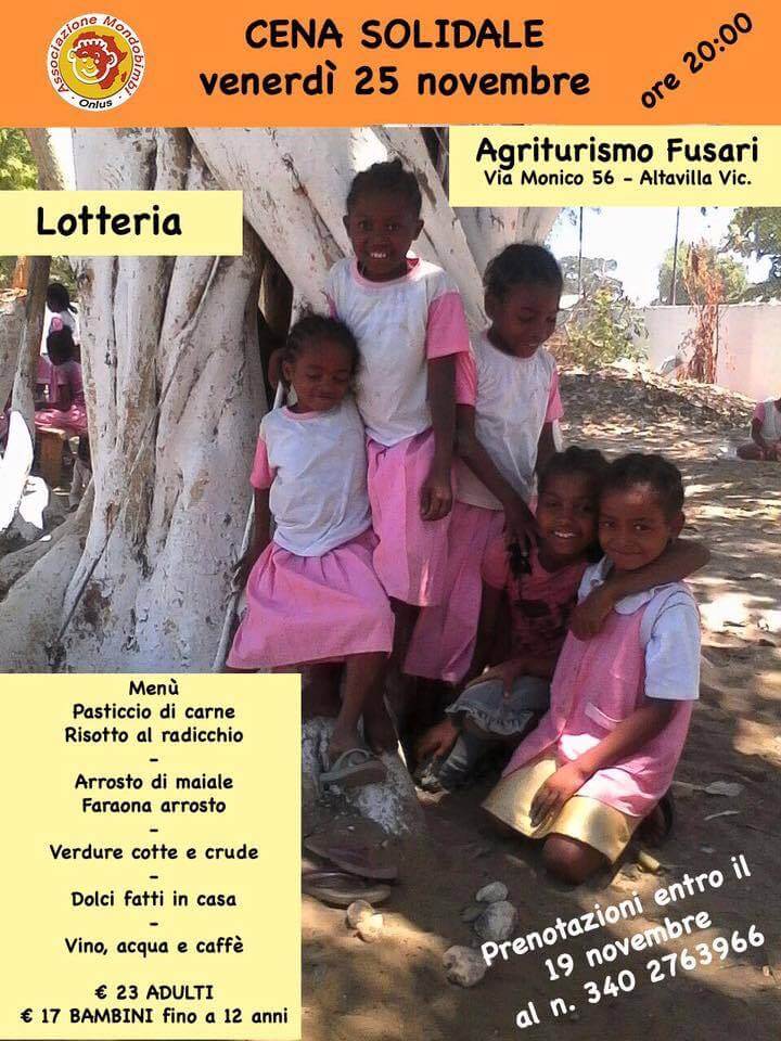L’associazione Mondobimbi Onlus ha organizzato per venerdì 25 novembre al ristorante Agriturismo Fusari in via Monico 56, una cena solidale che ha lo scopo di raccogliere fondi per l’associazione Mondobimbi che da anni è particolarmente attiva nel territorio vicentino e con le sue iniziative ha permesso di aiutare molti bambini che vivono in stato di assoluta povertà. Si tratta di un gruppo di persone sensibili al dramma dell’infanzia che soffre per abbandono e povertà e nei suoi scopi è chiaramente indicato un sogno, quello di aiutare tanti bambini, donando loro scuola assistenza sanitaria e nutrimento.
