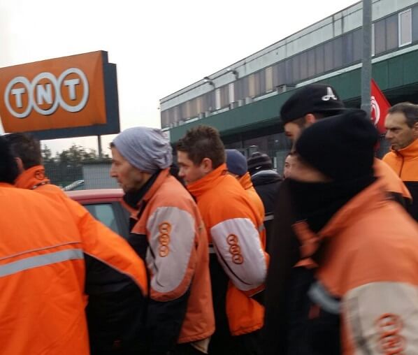 Sciopero dei corrieri, autisti e magazzinieri alla TNT Traco nel “cantiere” di via Retrone ad Altavilla Vicentina.