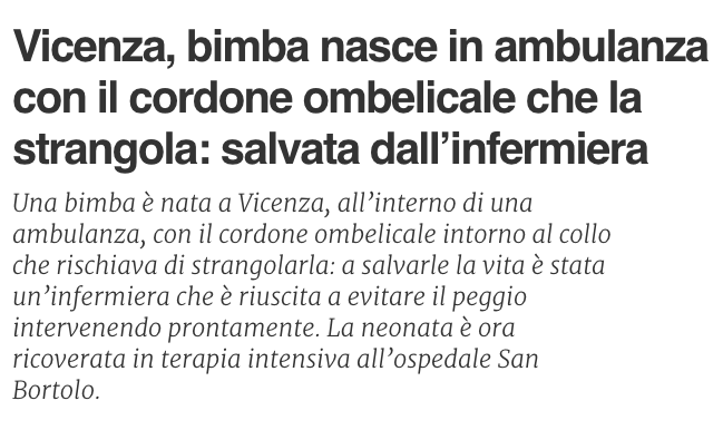 “I contenuti non sono congruenti ai fatti. Vogliamo con questo comunicato smorzare i toni allarmistici sui parti in casa e allontanare i vari falsi miti sul cordone ombelicale attorno al collo, usato dai media per creare pathos, ma senza evidenze scientifiche alcune. Come previsto dalla normativa italiana, l’ostetrica che segue la futura mamma durante la gravidanza, nel parto e del post parto, lo fa valutando in modo continuativo e dinamico il benessere di mamma e bimbo. Ecco cosa è successo esattamente la notte del 30 giugno scorso: un parto domiciliare programmato con le ostetriche DoraLuce ha visto la necessità di un trasferimento in travaglio di parto avanzato per un’iniziale deviazione della fisiologia fetale. Come richiesto dal personale Asl, durante la telefonata al 118, l’assistenza ostetrica Doraluce è proseguita durante il tragitto in ambulanza verso il San Bortolo. La stessa ostetrica ha assistito, con l’infermiera incaricata, alla nascita della neonata, ha fornito le prime cure e ha constatato le buone condizioni di mamma e bimba al primo minuto di vita. Dopo alcuni minuti, le condizioni cliniche della neonata sono peggiorate e l’ostetrica ha decretato la necessità di intervenire supportando la respirazione della neonata Questo perchè l’ostetrica domiciliare è addestrata per garantire le prime cure al neonato e alla puerpere anche in emergenza. Le due professioniste hanno così agito in equipe fino all’arrivo in ospedale. In pronto soccorso, i parametri clinici erano migliorati e la presa in carico è passata al personale dell’ospedale: ostetrica, ginecologo e oss. Non era presente un medico neonatologo. L’ostetrica è rimasta accanto alla paziente fino alla fine del post parto”.