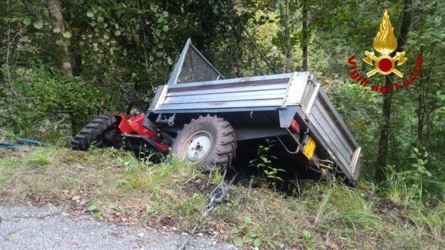 Alle 16.40 di ieri i vigili del fuoco sono intervenuti in via Roma ad Altissimo dopo un tornante della strada che collega Molina a Bolca per un trattorino con rimorchio rovesciatosi fuori strada sul pendio della collina: ferito l’agricoltore. Il settantenne alla guida del veicolo è stato sbalzato fuori ed è rimasto bloccato qualche metro sotto il ciglio stradale tra il veicolo e gli alberi. I pompieri arrivati da Arzignano e da Vicenza con il personale SAF (speleo alpino fluviale) hanno assicurato il veicolo che rischiava di scivolare finendo nella strada sottostante, riuscendo in sicurezza ad estrarre l’uomo, che è stato stabilizzato dal personale del suem 118, intervenuti anche con l’elisoccorso. L’uomo con un codice di media gravità è stato trasferito in ambulanza in ospedale. Recuperato il trattorino e il rimorchio. Le operazioni di soccorso si sono concluse dopo un paio d’ore.