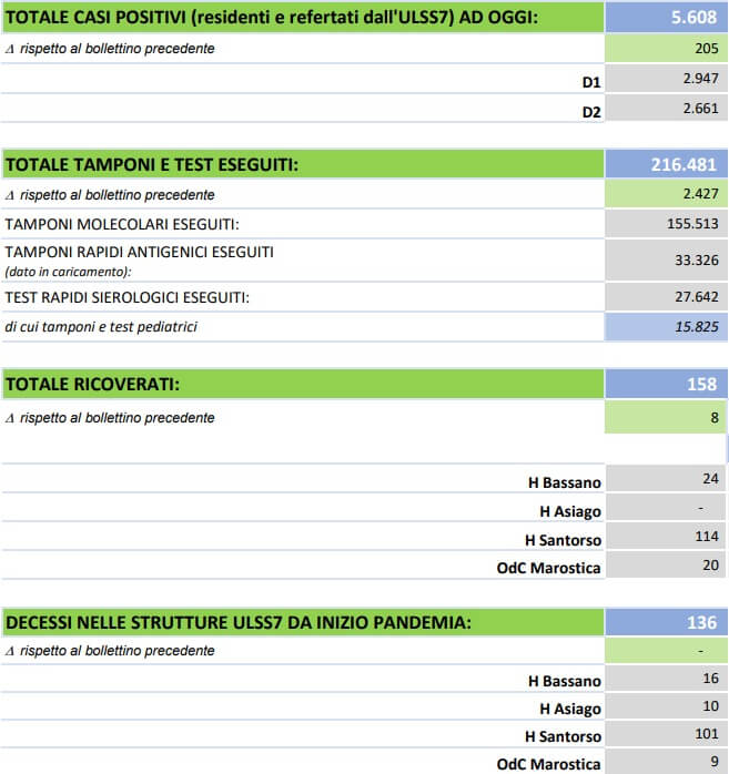 Ecco il bollettino giornaliero dell’Ulss 7 Pedemontana che comprende l’Alto Vicentino e il Bassanese. Sono 205 i nuovi contagiati e i ricoverati 158 (+8). Fortunatamente non ci sono deceduti rispetto a ieri