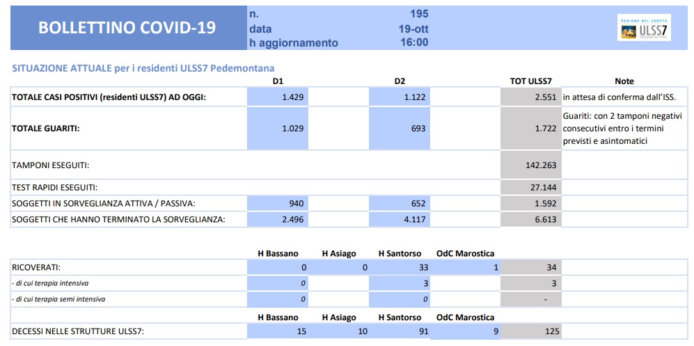 I ricoverati sono 33 a Santorso in area non critica, 1 a Marostica in area non critica e 3 in terapia intensiva a Santorso.