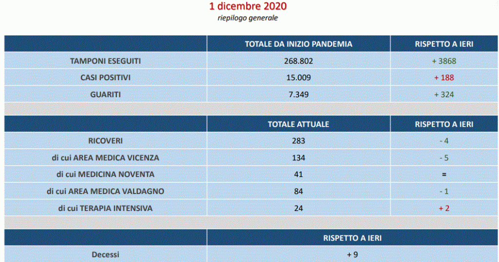 Ecco il bollettino quotidiano dell’Ulss 8 Berica. Confermato il trend di rallentamento dei contagi, dopo l’autentica ‘esplosione’ delle scorse settimane. Comincia a ridursi dopo qualche giorno di stabilizzazione, il numero dei ricoverati, ma rimane alto purtroppo il numero dei decessi nelle ultime 24 ore.