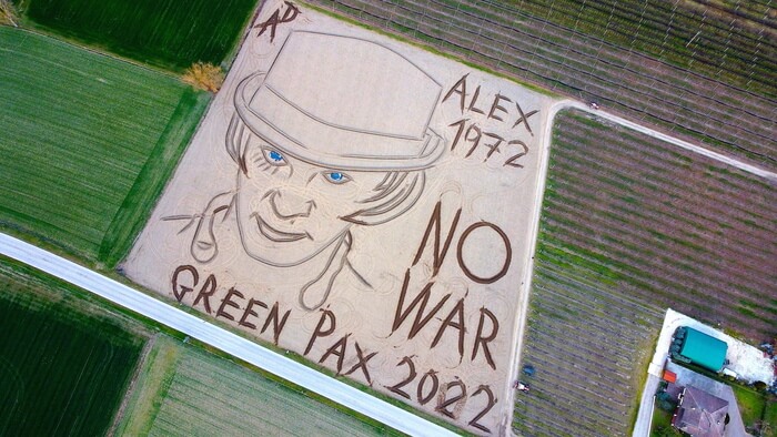 – E’ un omaggio ad Arancia Meccanica di Kubrick e al suo interprete, Alex DeLarge, a 50 anni dall’uscita della pellicola in Italia, e contro la guerra in Ucraina, l’ultima opera di “land art” dell’artista veneto Dario Gambarin, su un campo incolto di 27 mila metri quadrati a Castagnaro (Verona).