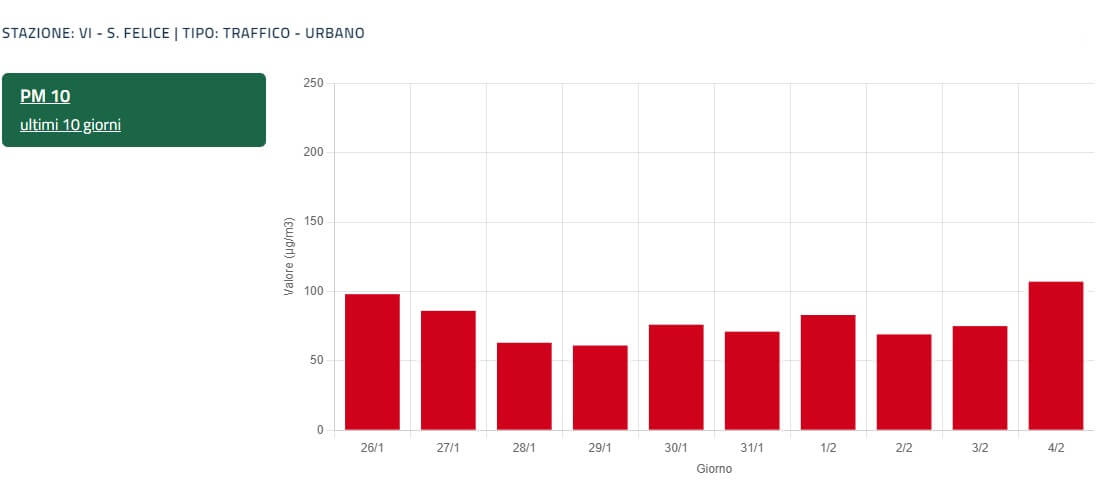 Questa mattina, infatti, l’Arpav ha comunicato che nel territorio comunale di Vicenza è stato raggiunto il livello di allerta rosso per il PM10, con le conseguenti limitazioni aggiuntive secondo quanto stabilito nell’Accordo di Bacino Padano e dal Pacchetto di misure straordinarie approvate dalla Regione del Veneto. (sopra: la tabella relativa alle rilevazioni Arpav di Pm10 a San Felice in città)