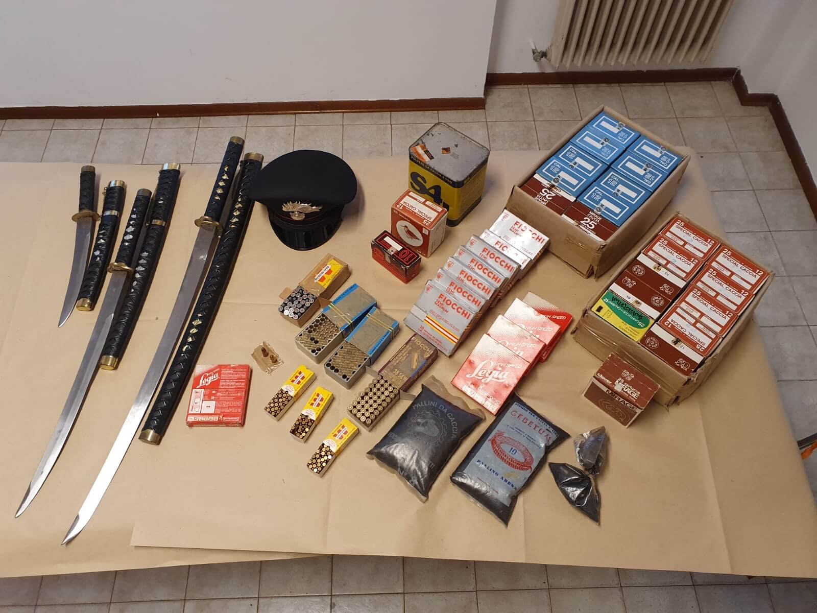 I militari, nel corso di una perquisizione, rinvenivano nell’abitazione del pensionato 1000 munizioni di vario calibro, per armi comuni e da caccia, kg. 1 di polvere da sparo e n. 3 katane in metallo, il tutto detenuto senza titolo autorizzativo.