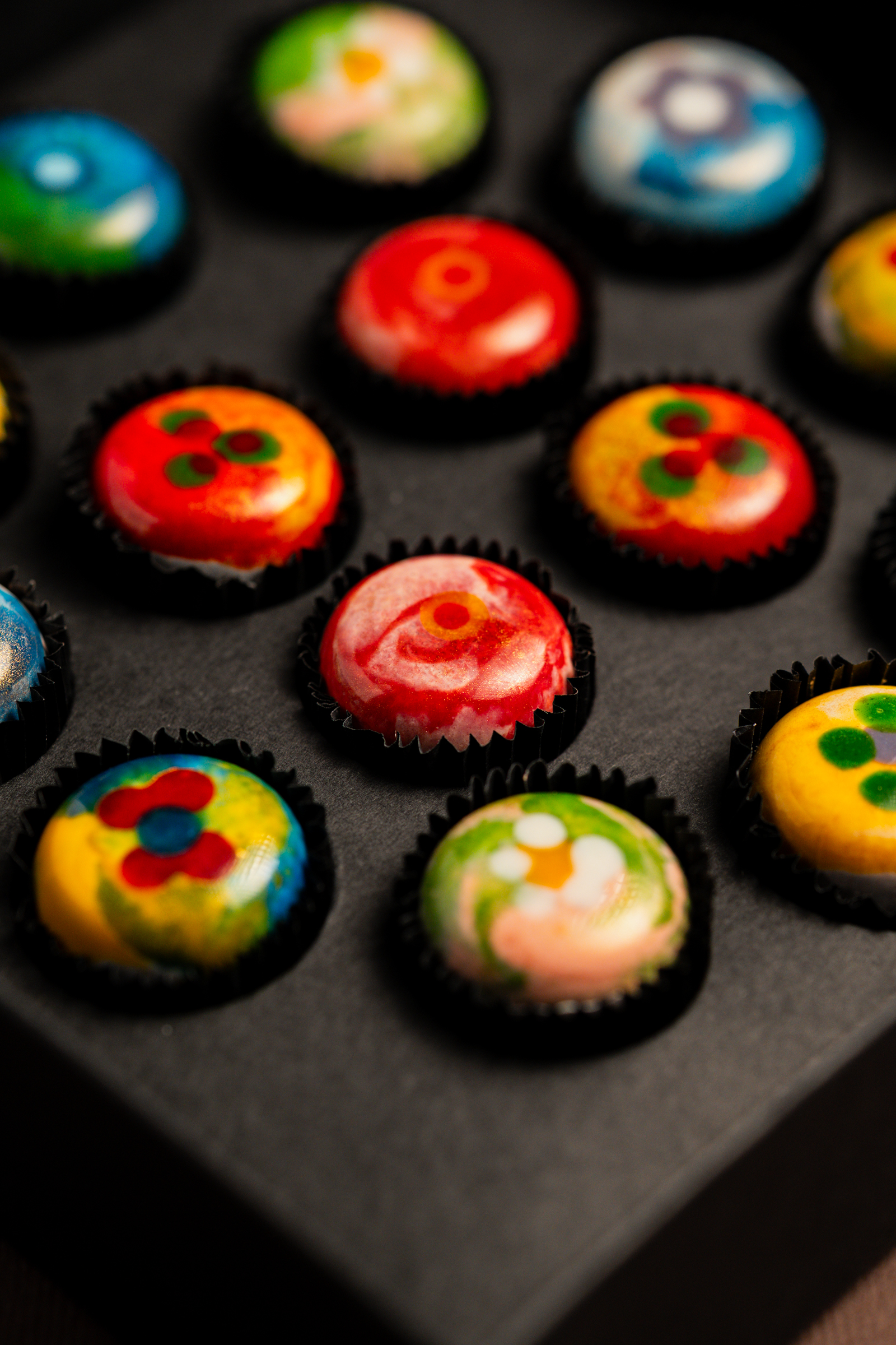 “L’idea è nata durante un evento a Venezia all’Hotel Monaco & Grand Canal, in cui sono stati serviti dei piatti decorati con le murrine – spiega Giulia Pinel –. Da qui il desiderio di tradurre in cioccolato la bellezza del vetro di Murano, arricchendola dei sapori tipici della città. Volevamo un prodotto che fosse allo stesso tempo emozione visiva e viaggio nel gusto, qualcosa che non fosse solo dolce, ma memoria, territorio e sorpresa in un morso. Ci sono voluti cinque anni di ricerca e perfezionamento per affinare le tecniche che rendono queste praline così speciali”.
