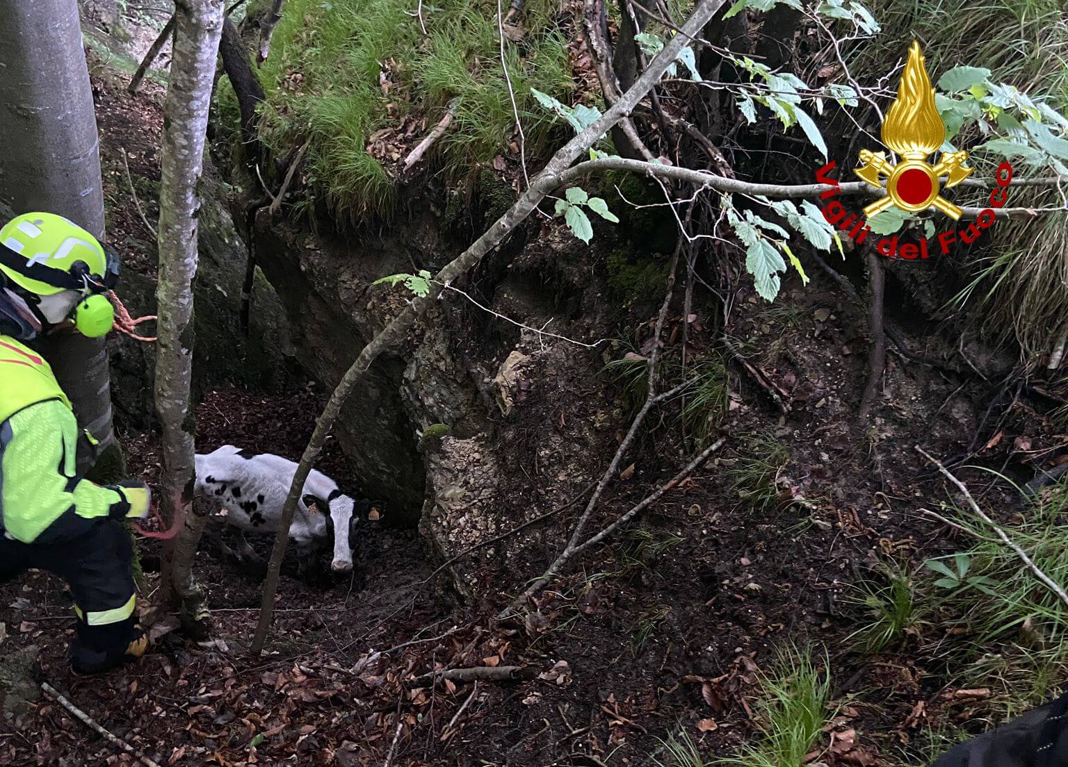 I vigili del fuoco intervenuti da Schio, sono riusciti a issare a mano il bovino fino ad un punto dove è stato fatto intervenire l’elicottero del reparto volo di Venezia per il recupero.
