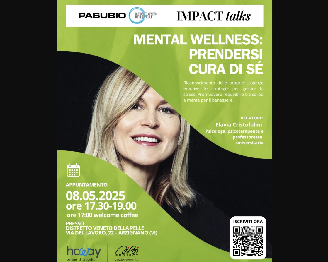ARZIGNANO, 30 APRILE 2025 – Prosegue il ciclo di incontri IMPACT Talks, un’iniziativa ideata da Pasubio Group in collaborazione con il Distretto Veneto della Pelle, che giovedì 8 maggio 2025 propone il terzo evento dal titolo “Mental Wellness: prendersi cura di sé”, con l’obiettivo di stimolare una riflessione concreta e attuale sul benessere psicologico individuale e collettivo.