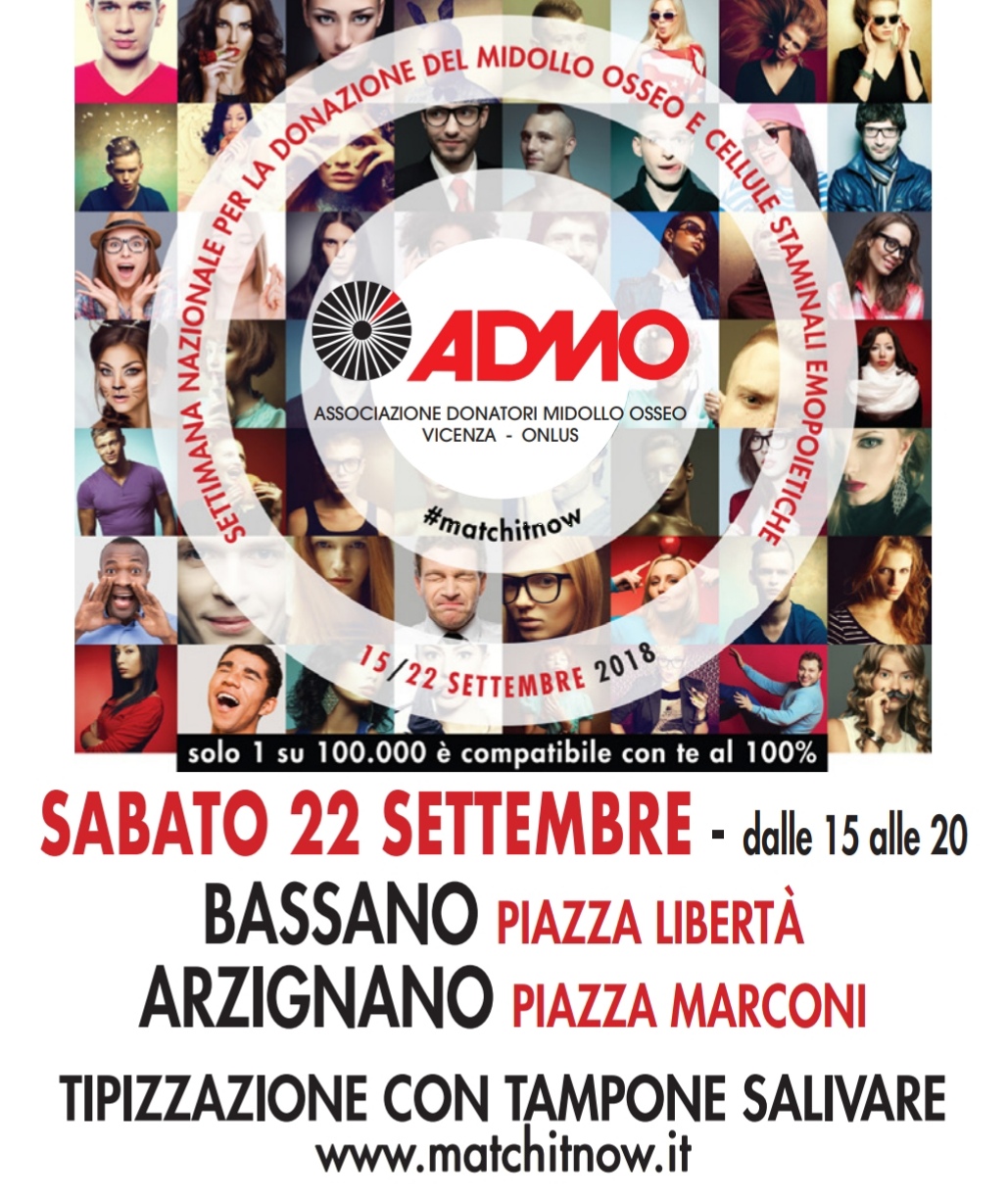 Dal 15 fino al 22 settembre torna Match it now, l’evento nazionale dedicato alla donazione di midollo osseo e di cellule staminali emopoietiche promosso dal centro nazionale trapianti, centro nazionale sangue, Registro italiano donatori di midollo osseo, dalla federazione Admo e dalla federazione Adoces. La settimana è patrocinata dal Ministero della Salute e dal Comitato Olimpico Nazionale Italiano CONI, e si inserisce nelle manifestazioni di celebrazione per la Giornata mondiale del donatore di midollo osseo – World Marrow Donor Day, organizzata dallaWorld Marrow Donor Association. Admo sarà presente nel Vicentino a Bassano in piazza Libertà e ad Arzignano in piazza Marconi dalle 15 alle 20 con eventi, iniziative e informazioni sulla donazione. Sarà inoltre possibile accedere immediatamente al primo screening necessario per l’iscrizione nel Registro Italiano Donatori di Midollo Osseo.