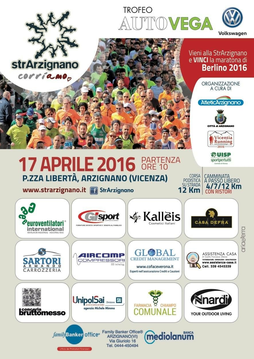 Domenica 17 aprile 2016 si svolgerà la terza edizione della StrArzignano: una corsa podistica su strada aperta a tutti che attraverserà buona parte del territorio della Città di Arzignano con percorsi di 4-7-12 km da percorrere a passo libero, in modo da agevolare la partecipazione di più persone possibile che potranno scegliere liberamente quale percorso affrontare.