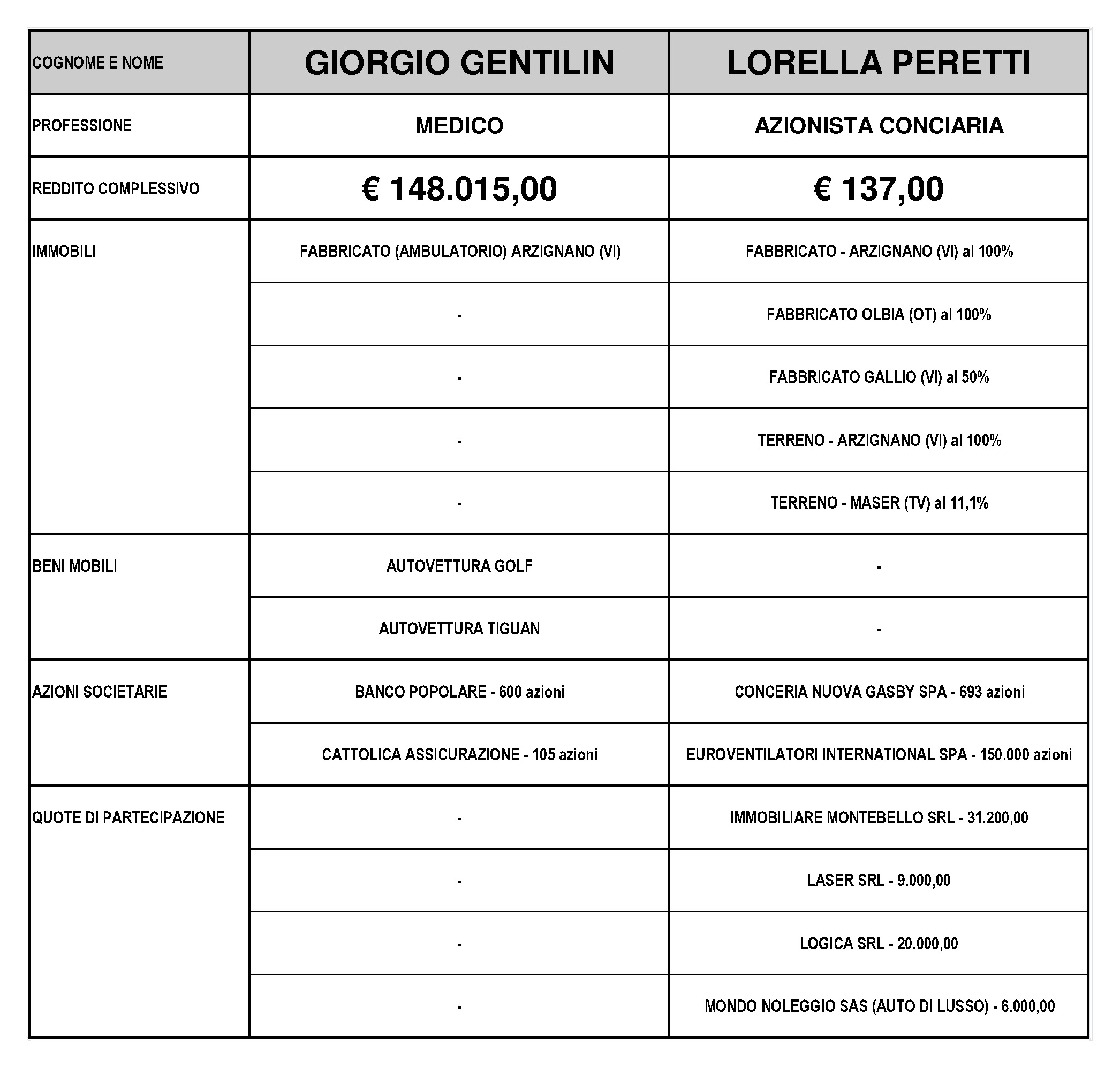 Completiamo il breve profilo dei due candidati con le rispettive schede patrimoniali pubblicate, per legge, sul sito del comune di Arzignano.