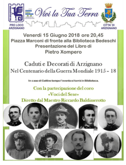 Venerdì 15 Giugno ore 20,45 Piazza Marconi fronte Biblioteca Bedeschi, in occasione del centenario della Grande Guerra, la Pro Loco di Arzignano e l’Amministrazione Comunale di Arzignano presentano il libro di Pietro Xompero : Caduti e Decorati di Arzignano nel Centenario della Guerra Mondiale 1915-18, edito dal Comune di Arzignano. All’evento parteciperà il Coro Voci del Sese diretto dal Maestro Riccardo Baldisserotto